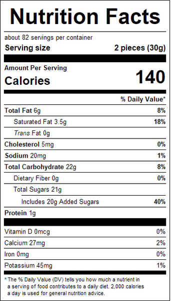 "ingredients": "Sugar, Cocoa Butter, Milk, Chocolate Liquor, Salted Butter, Invert Syrup, Whole Milk Powder, Cherries (sugar and/or glucose-fructose syrup and/or corn syrup and/or high fructose corn syrup, citric acid, sodium benzoate and potassium sorbate [preservatives], artificial flavor, red 40, calcium chloride and/or calcium carbonate [a firming agent], sulphur dioxide [a preservative]), Corn Syrup, High Fructose Corn Syrup, Invertase (with glycerol), Natural and Artificial Flavors, Soy Lecithin, Vanilla.Contains milk, soy.Shares equipment with products containing peanuts, tree nuts, egg and wheat.",