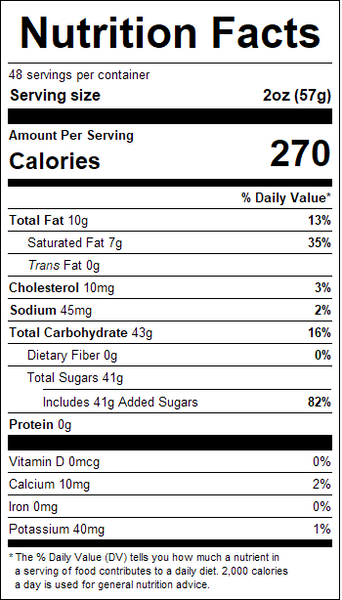 "ingredients": "Sugar, Cream, Butter, Palm Oil, Corn Syrup Solids, Brown Sugar, Dutch Cocoa, Belgian Chocolate Liquor, Semi-sweet Chocolate (sugar, unsweetened chocolate, cocoa butter, soy lecithin, natural vanilla extract), Potassium Sorbate (prevents mold), Salt, Natural Flavors.Contains milk, soy.Processed shared equipment processing peanuts, tree nuts, milk, eggs, soy, sulfites, sulfites, and wheat.",