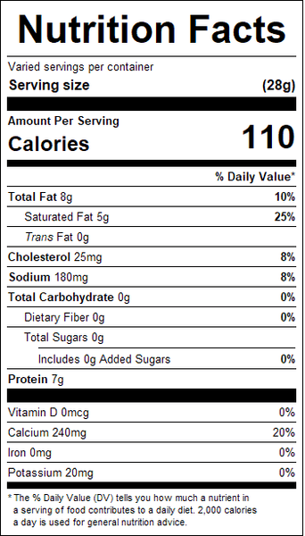 "ingredients": "Pasteurized Milk, Salt, Enzymes, Cheese Cultures, Annatto Coloring.",
