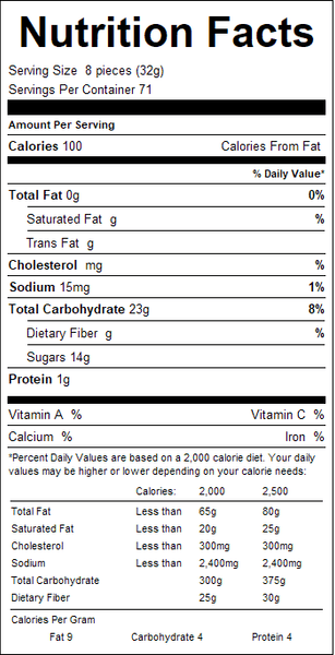 "ingredients": "Corn Syrup, Water, Gelatin, Citric Acid, Artificial and Natural Flavor, Pectin, Vegetable Oil (coconut, canola) and Carnauba Leaf Wax, Colors (from fruit juice, vegetable juice, FD&C red #40, FD&C blue #1).",
