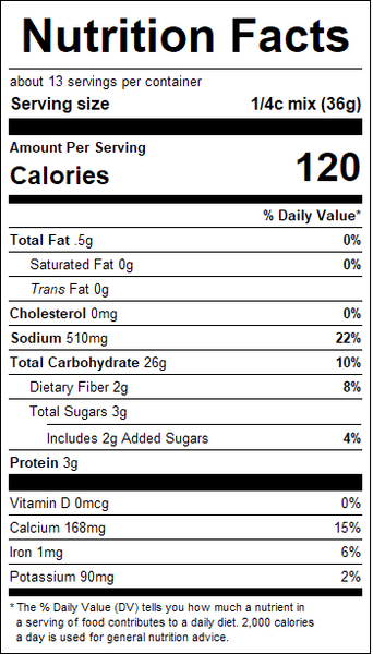 "ingredients": "Buckwheat Flour, Long Grain Rice Flour, Corn Flour, Dark Buckwheat Flour, Potato Starch, Whole Sorghum Flour, Sugar, Leavening (monocalcium phosphate, sodium bicarbonate), Tapioca Starch, Sweet Cream Buttermilk, Sweet Whey, Salt.Contains milk.",
