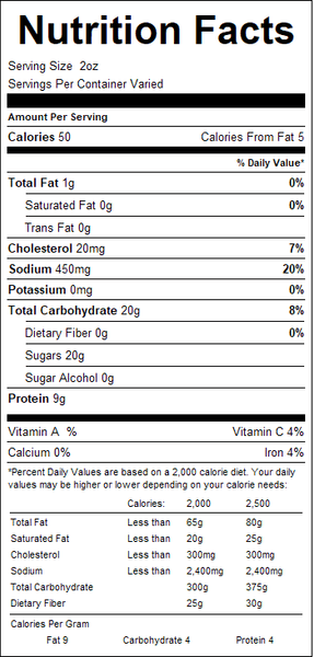 "ingredients": "Cured With:Water, Salt, Sugar, Sodium Tripolyphosphate, Carmel Color.",