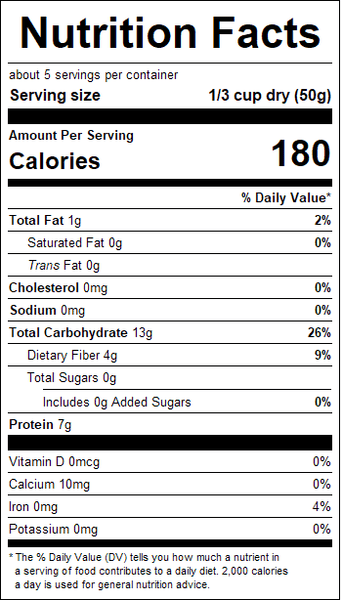"recipe": "1 1/4 cups of water or vegetable broth for every 1 cup of dry grain. Simmer the grains stovetop, covered, for about 10 minutes. The grains fluff up just slightly, and, like barley, they have more an \"al dente\" mouth feel when done cooking.<br />For a basic recipe with a bit more flavor, toast the dried pearls for a minute or two in a bit of butter, vegan margarine, or olive oil before cooking.",