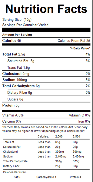 "ingredients": "Shortening Powder (palm oil, corn syrup solids, sodium caseinate, dipotassium phosphate, mono and diglycerides), Modified Corn Starch, Wheat Flour, Salt, Maltodextrin, Spices, Caramel Color. Allergens: Milk and Wheat.",