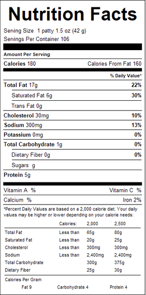 "ingredients": "Pork, water, salt, spices, dextrose, BHT, Citric acid, propyl gallate",