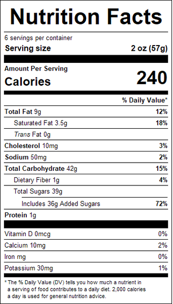 "ingredients": "Sugar, Pecans, Pumpkin, Cream, Butter, Palm Oil with Soy Lecithin, Corn Syrup Solids, Brown Sugar, Potassium Sorbate (prevents mold), Salt, Spices, Natural and Artificial Flavors.Allergen Statement: Contains Milk, Pecans, and Soy.Processed on shared equipment used to process peanuts, tree nuts, milk, soy, sulfites, and wheat.",