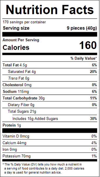 "ingredients": "Cane Sugar, Corn Syrup, Coconut Oil, Nonfat Dry Milk, Whey, Salt, Sunflower Lecithin, Sodium Bicarbonate, and Natura Pumpkin Flaors.Contains milk.Manufactured in a facility that processes peanuts and uses milk, eggs, and tree nuts.",