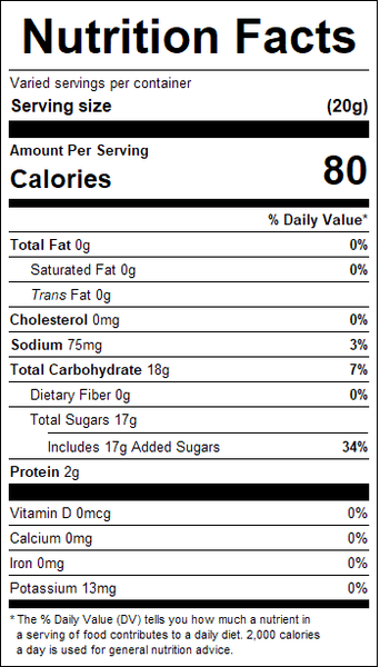 "ingredients": "Sugar, Cane Sugar, Gelatin Blend (gelatin, furmaric acid, sodium citrate, contains 2% or less of salt, potassium sorbate [preservative], red 40, sugar, artificial flavoring, yellow 6, dimethylpolysiloxane, blue 1), Yellow 5, Yellow 5 Lake, Yellow 6, Yellow 6 Lake, Red 40, Red 40 Lake, Blue 1, Blue 1 Lake, Green Lake<br />Processed on equipment that also processes: Crustacean Shellfish, Egg, Fish, Milk, Peanut, Sesame, Soy, Tree Nuts (Almond, Brazil Nut, Cashew, Coconut, Filbert (Hazelnut), Macadamia Nut, Pecan, Pine Nut, Pistachio, Walnut) and Wheat.",