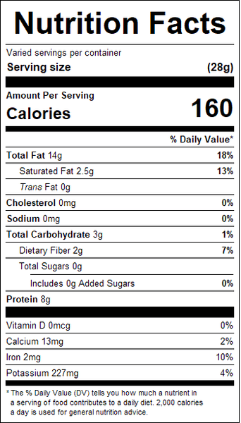 "ingredients": "Raw Pumpkin Seeds.<br />Processed on equipment that also processes: Crustacean Shellfish, Egg, Fish, Milk, Peanut, Sesame, Soy, Tree Nuts (Almond, Brazil Nut, Cashew, Coconut, Filbert (Hazelnut), Macadamia Nut, Pecan, Pine Nut, Pistachio, Walnut) and Wheat.",