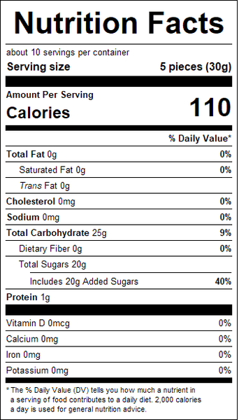 "ingredients": "Red and Black Berries (sugar, glucose syrup, gelatine [pork], acidifier [citric acid], natural flavoring [raspberry, blackberry], coloring [carmine (natural), Red 40, (artificial), iron oxide (natural), blue 2 (artificial), ammonia caramel (natural)], arabic gum [emulsifier] , vegetable oil [coconut], beeswax [glazing agent]).<br />Processed on equipment that also processes: Crustacean Shellfish, Egg, Fish, Milk, Peanut, Sesame, Soy, Tree Nuts (Almond, Brazil Nut, Cashew, Coconut, Filbert (Hazelnut), Macadamia Nut, Pecan, Pine Nut, Pistachio, Walnut) and Wheat.",