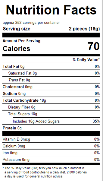 "ingredients": "Sugar, Corn Syrup, Contains 2% or less of: Yellow 5, Yellow 6, Red3, Red 40, Blue 1, Caramel Color.",