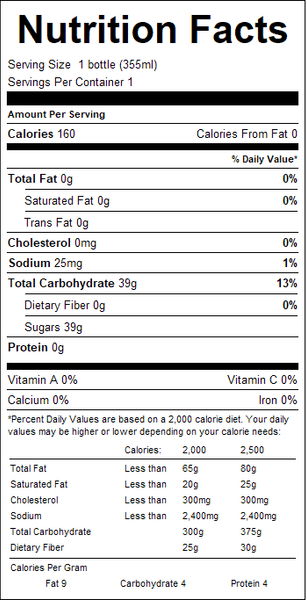"ingredients": "Triple-filtered carbonated water, pure cane sugar, caramel color, natural & artificial flavor, citric acid, sodium benzoate (a preservative), yucca extractives and acacia. Contains no caffeine - very low sodium.",