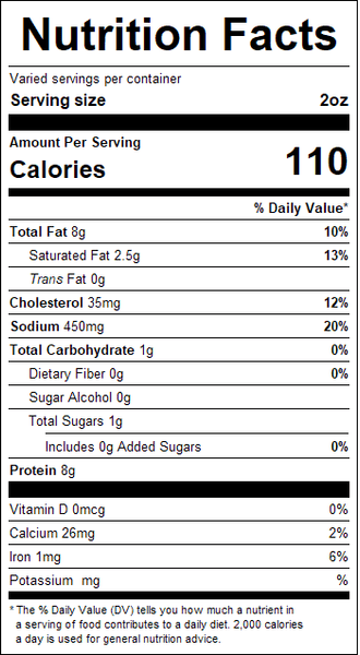 "ingredients": "Beef, Water, Salt, Sodium Lactate, Spices, Sodium Phosphate, Sugar, Sodium Diacetate, Sodium Erythorbate Garlic, Sodium Nitrate.",