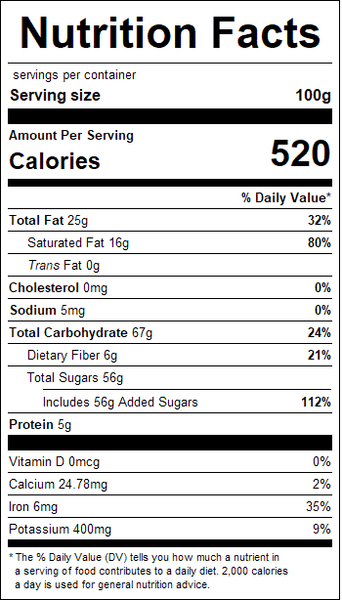 "ingredients": "Sugar, Unsweetened Chocolate, Cocoa Butter, Anhydrous Dextrose, Soy Lecithin (an emulsifier), Vanilla Extract. May contain milk.",