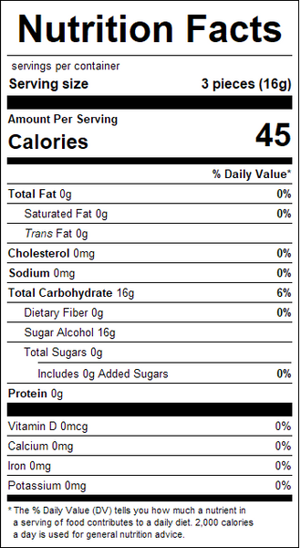 "ingredients": "Polyglycitol Syrup, Color Added Titanium Dioxide, Natural Peppermint Oil, Red 40, Blue 1, Sucralose.",