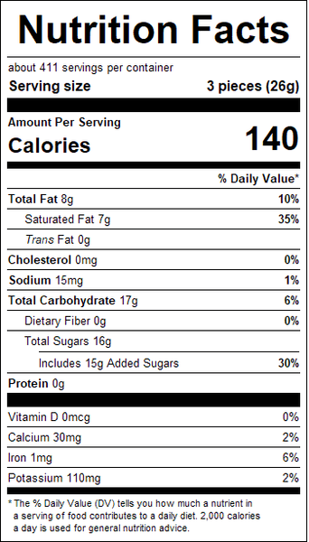 "ingredients": "Sugar, Hydrogenated Vegetable Oil (Palm Kernel, Coconut, And/Or Palm), Whey, Cocoa (Processed With Alkali), Lactose, Skim Milk, Soy Lecithin (Emulsifier) And Vanillin (Artificial Flavor).<br /><br />Contains Milk And Soy.<br /><br />Manufactured On Equipment Which Processes Wheat, Peanut Butter And Almonds.",