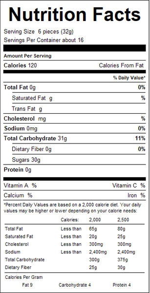 "ingredients": "Cane Sugar, Invert Sugar, Oil of Peppermint*, Red 40, Red 40 Lake.*Adds a trivial amount of fat.",