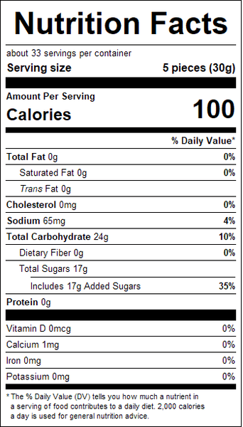 "ingredients": "Corn Syrup, Sugar, Modified Potato Starch, Dextrose, Potato Protein; Acids: Citric Acid, Malic Acid; Acidity Regulator: Sodium Citrates, Sodium Malates; Fruit and Vegetable Juice for Color: Turmeric, Apple, Radish, Pumpkin, Tomato; Natural and Artificial Flavor.",