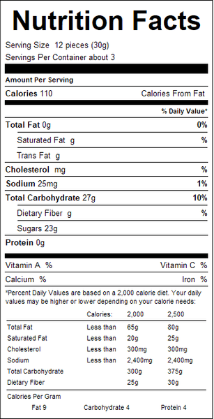 "ingredients": "Sugar, Invert Sugar, Corn Syrup, Modified Cornstarch, Contains less than 2% of Tartaric Acid, Citric Acid, Natural and Artificial Flavor, Titanium Dioxide (for color), Yellow 6, Red 40, Yellow 5, Blue 1.",