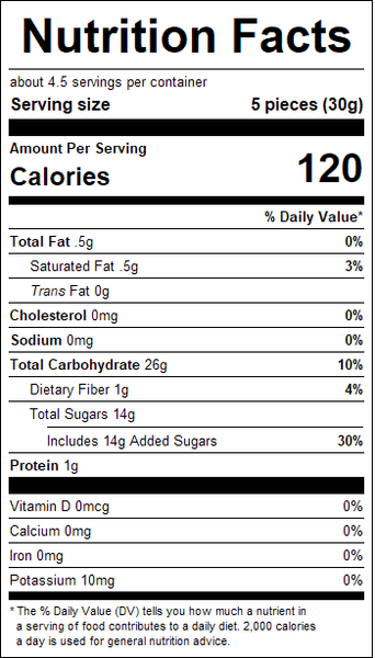 "ingredients": "Corn Syrup, High Fructose Corn Syrup, Wheat Flour, Sugar, Citric Acid, Malic Acid, Tartaric Acid, Glyceryl, Monostearate, Glycerin, Artificial Flavor, Capsaicin, Color added Red 40, Yellow 5, Yellow 6 and Blue 1.Contains wheat.",