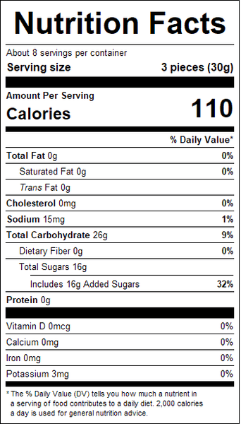 "ingredients": "Spearmint Leaves (sugar, corn syrup, modified corn starch, lactic acid, sorbitol, sodium citrate, artificial flavors, artificial colors [FD&C yellow #5 , FD&C blue #1]).<br />Processed on equipment that also processes: Crustacean Shellfish, Egg, Fish, Milk, Peanut, Sesame, Soy, Tree Nuts (Almond, Brazil Nut, Cashew, Coconut, Filbert (Hazelnut), Macadamia Nut, Pecan, Pine Nut, Pistachio, Walnut) and Wheat.",