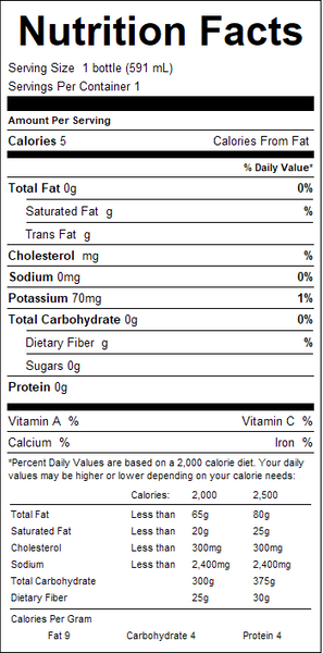 "ingredients": "Carbonated Water, Citric Acid, Natural Flavor, Potassium Benzoate (a preservative), Sucralose, Acesulfame Potassium.",