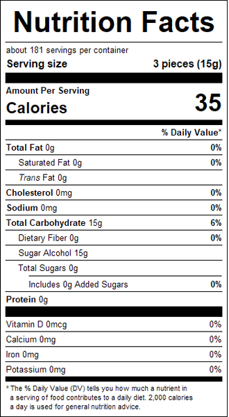 "ingredients": "Isomalt, Maltitol Syrup, Natural Flavor (peppermint), Artificial Color (titanium dioxide), Sucralose, High Oleic Sunflower Oil, FD&C Red #40, Propylene Glycol, Citric Acid, FD&C Blue #1.ATTENTION: This product may cause asphixia, particularly in children.Excess consumption may have a laxative effect.<br /><br />Made with Bioengineered Ingredient(s).",