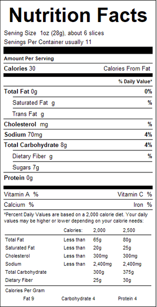 "ingredients": "Cucumbers, Water, Sugar, Onions, Vinegar, Salt, Spices, Turmeric and Polysorbate 80.",