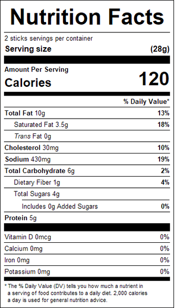 Sweet n' Spicy Snack Sticks are made with a mixture of chicken and beef and are seasoned with a delicious blend of brown sugar and spices for a sweet, spicy and smoky taste in every bite! Each case consists of 2/2.5 pounds.