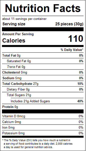 "ingredients": "Dextrose, Corn Syrup, Sugar, Modified Cornstarch, Contains 2% or less of: Malic Acid (DL-Malic Acid), Water, Tapioca Dextrin, Carnauba Wax, Shellac, Natural and Artificial Flavors, Yellow 5, Red 40, Sodium Citrate, Blue 1, Yellow 6.",