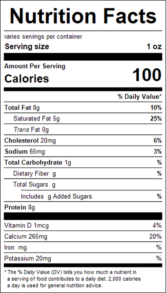 "ingredients": "PASTEURIZED MILK, CULTURES, ENZYMES, SALT",