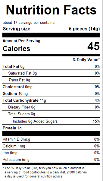 "ingredients": "Apple Juice from Concentrate, Corn Syrup, Sugar, Gelatin, Modified Corn Starch, less than 2% of the following: Absorbic Acid (vitamin C), Natural Flavors, Spirulina Extract (color), Black Carrot Juice (color), Paprika Oleoresin (color), Blueberry Juice (color), Citric Acid, Sodium Citrate, Carnauba Wax.",