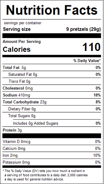 Crunchy pretzels sprinkled with a generous amount of coarse salt. Enjoy them on their own as a snack, add them to your favorite mix or use them to scoop up your favorite dips.