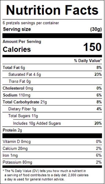 "ingredients": "Chocolate Flavored Confectonery Coatng [Sugar, Palm Kernel And/Or Palm Oil, Cocoa Powder, Whey Powder, Nonfat Dry Milk, Soy Lecithin, Natural Vanilla Extract], Pretzels [Unbleached Enriched Wheat Flour (Flour, Niacin, Reduced Iron, Thiamine Mononitrate-B1, Ribofavin-B2, Folic Acid), Malt, Salt, Soybean And/Or Canola Oil, And Yeast], Tofee Pieces [Sugar, Palm Oil, Dairy Buter (Milk), Almonds, Contains 2% Or Less Of Salt, Sunfower Oil, Lecithin (Soy)].<br /><br />Contains: Milk, Wheat And Soy Ingredients. <br /><br />May Contain Traces Of Peanuts & Tree Nuts.",