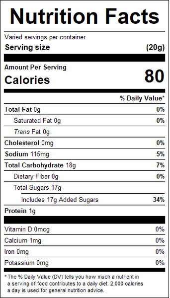 "ingredients": "Cane Sugar, Gelatin Blend (gelatin, fumaric acid, sodium citrate, contains 2% or less of potassium sorbate [preservative], salt, sugar, dimethylpolysiloxane), Natural and Artificial Watermelon Flavor, Natural Flavors, Salt) Yellow 5, Yellow 5 Lake, Yellow 6, Yellow 6 Lake, Red 40, Red 40 Lake, Blue 1, Blue 1 Lake, Green Lake.<br />Processed on equipment that also processes: Crustacean Shellfish, Egg, Fish, Milk, Peanut, Sesame, Soy, Tree Nuts (Almond, Brazil Nut, Cashew, Coconut, Filbert (Hazelnut), Macadamia Nut, Pecan, Pine Nut, Pistachio, Walnut) and Wheat.",