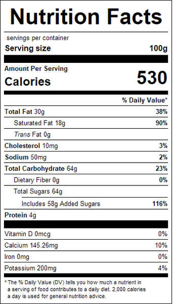 "ingredients": "Sugar, Cocoa Butter, Nonfat Dry Milk, Butteroil, Soy Lecithin (an emulsifier), Natural Flavor.",