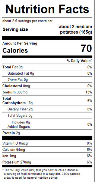 "ingredients": "Potatoes, Water, Salt, Calcium Chloride (to promote firmness), Calcium Disodium EDTA (to promote color retention).",