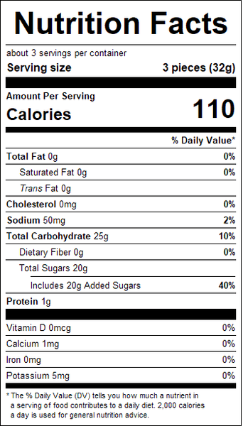 "ingredients": "Corn Syrup, Sugar, Gelatine, Acids (citric acid, malic acid), Humectant (glycerol), Invert Sugar Syrup, Gelling Agent (pectin), Acidity Regulator (sodium malates, sodium citrates), Natural and Artificial Flavor, Color (yellow 5, blue 1).",